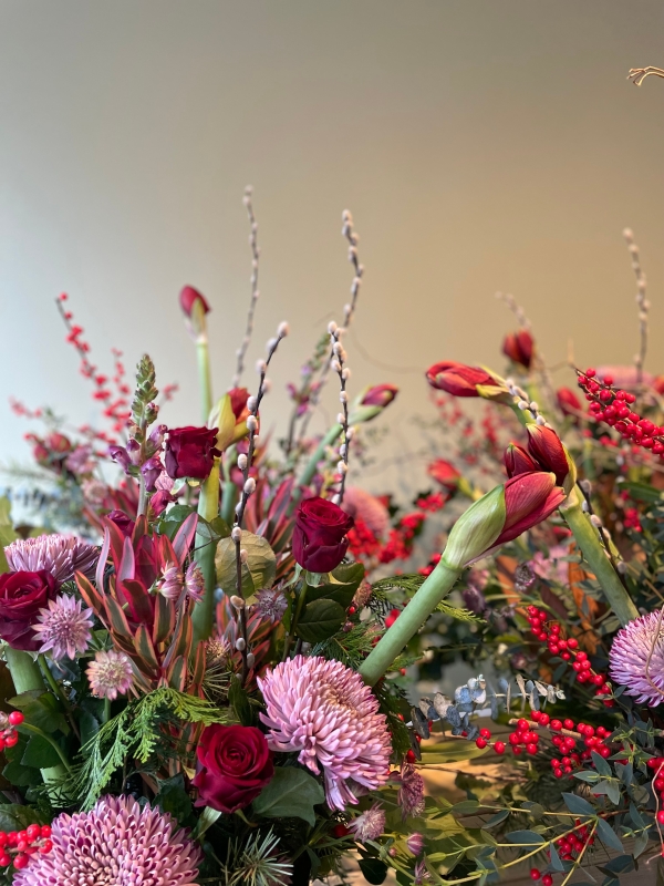 A showstopper of a vase, perfect for hosting at Christmas or adding some an impressive floral display to your home. Flowers are subject to availability but will feature blooms such as Amaryllis, Ilex berries, velvety red roses, deep purple chrysanthemums, pine and eucalyptus foliages, pussy willow and more. This luxurious arrangement arrives already arranged in a vase, ready to be placed in your home.