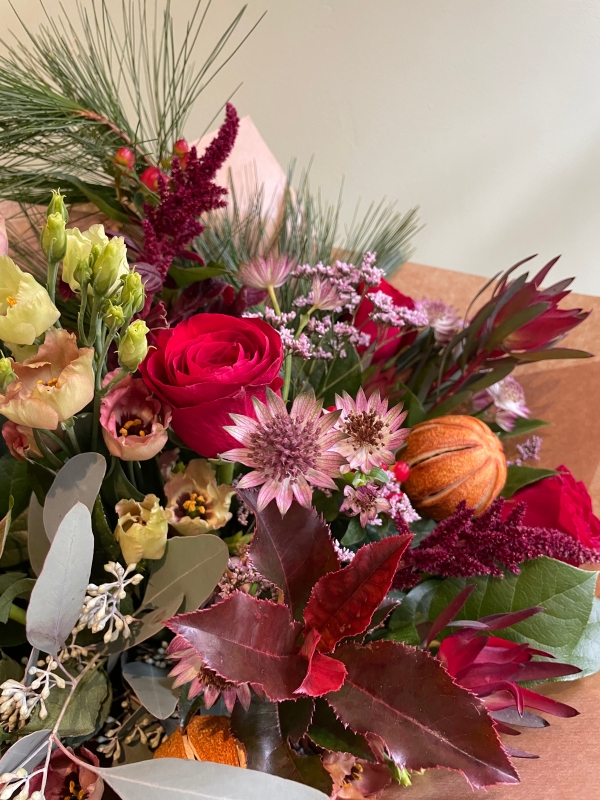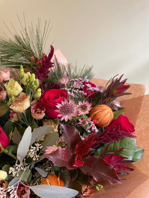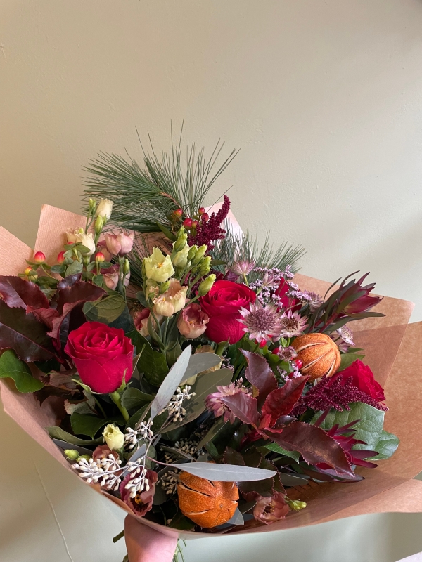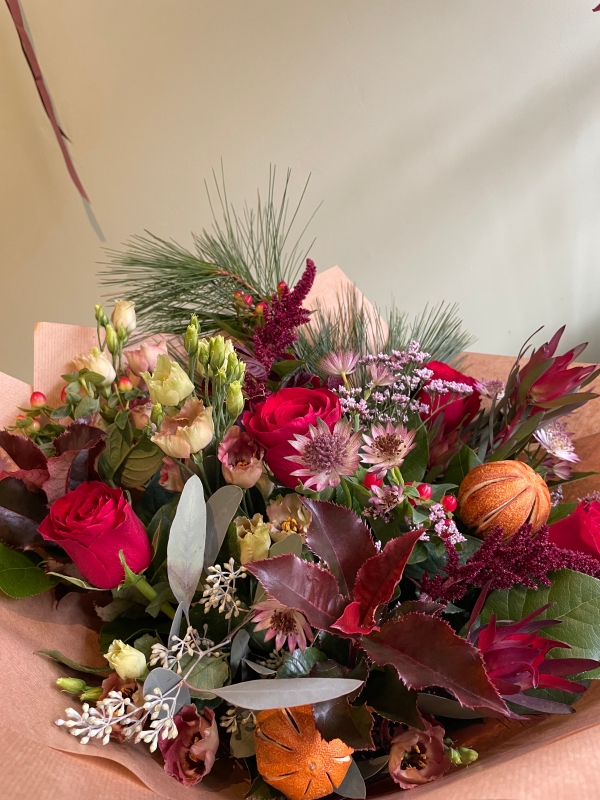 Floral, Fruity and Fragrant! This bouquet is bursting with a florist choice mixture of Christmas colours combined with a citrus twist and lovely textured foliage.