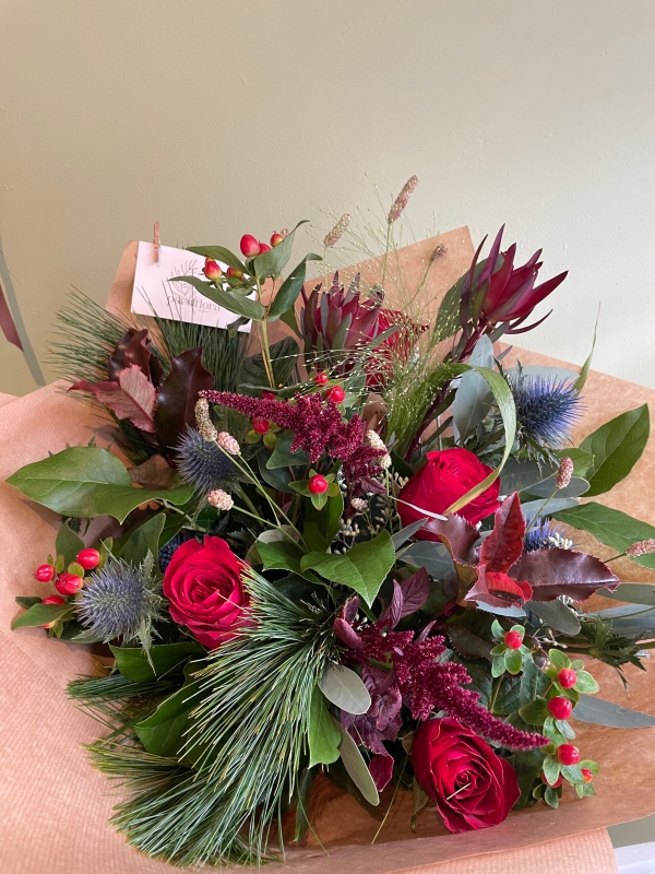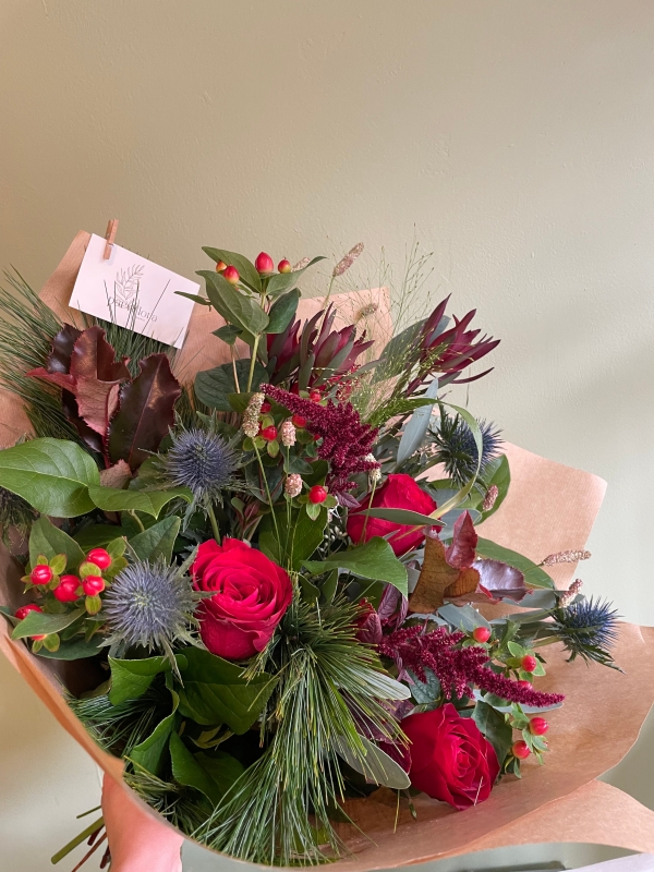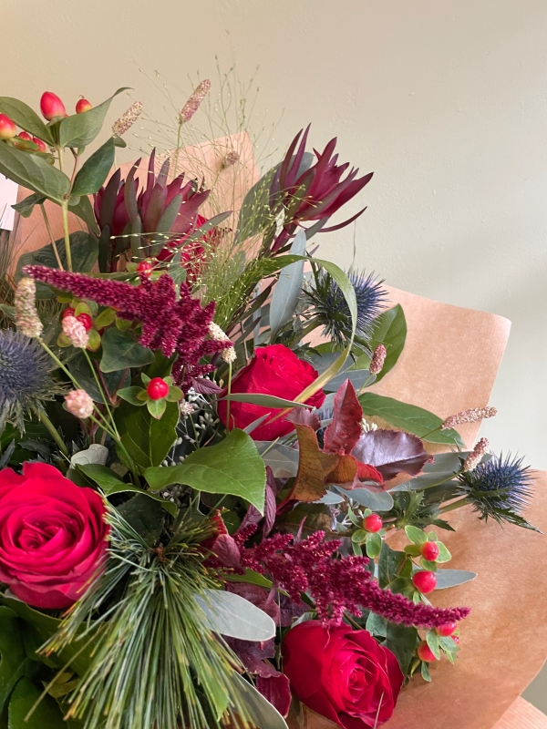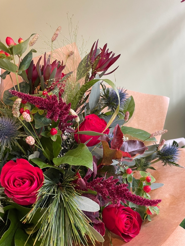 This bouquet features a mixture of pine and strobus foliages with flowers like amaranthus, roses, berries and leucadendron, with a pop of blue thistle for contrast. Perfect to send as a gift or to order for the house for some festive colour.